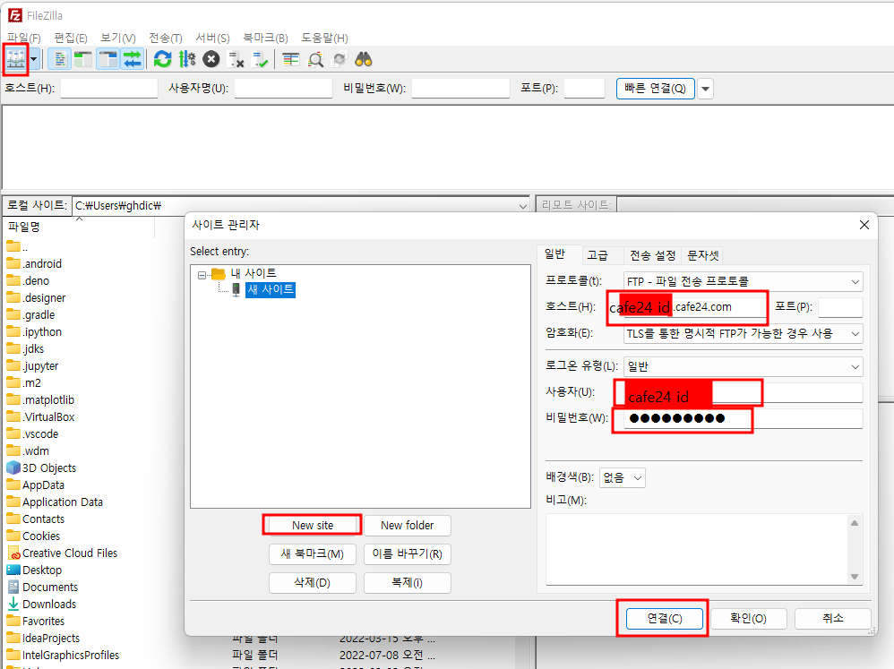 FTP아이디 - cafe24 id, FTP비밀번호 - 호스팅서버구매시 적었던 비밀번호
