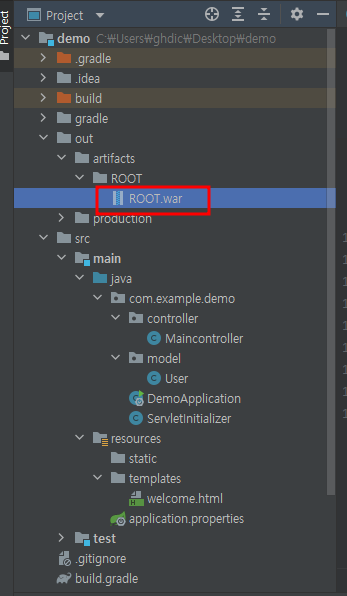 정상적으로 따라왔으면 다음과같은 경로에 ROOT.war이 생성된것을 확인할 수 있다.