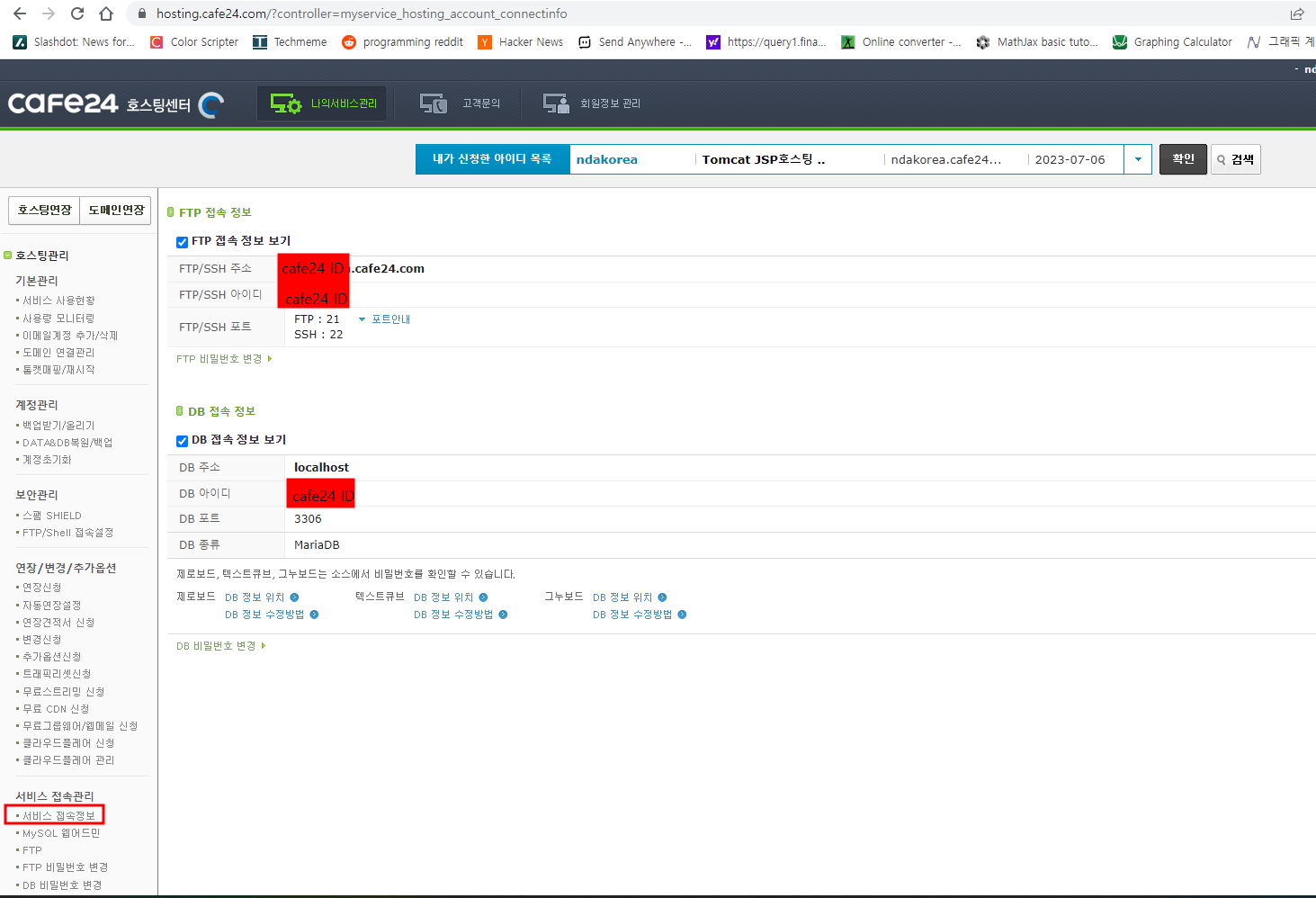 구매한 호스팅관리페이지에서 서비스접속정보에들어 가면 다음과같이 FTP와 DB에 대한 설명이 쓰여져 있다.