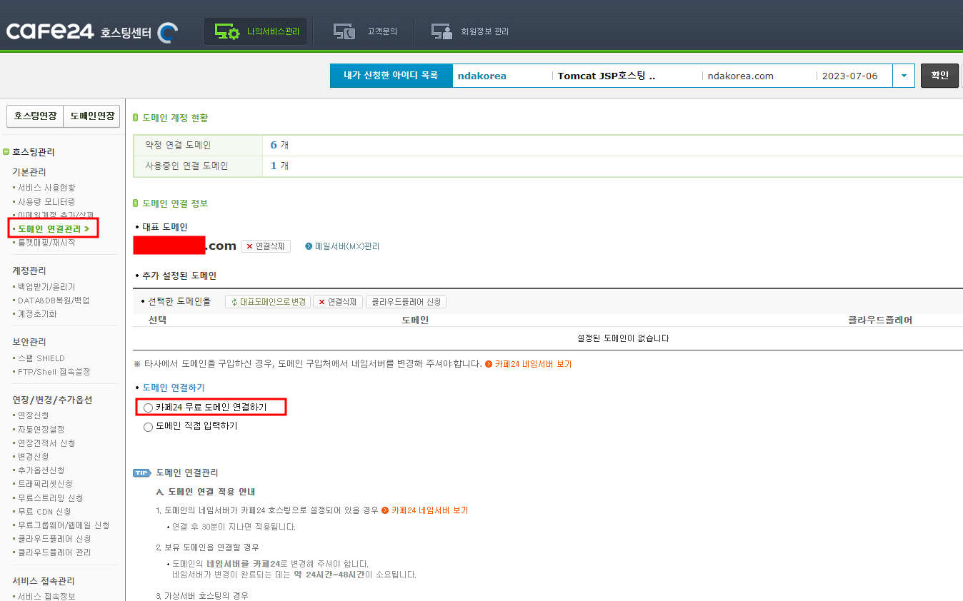 본인이 사용하는 도메인이 있다면 연결해주고 없다면 카페24 무료 도메인으로 만들어서 대표도메인으로 설정해주자
