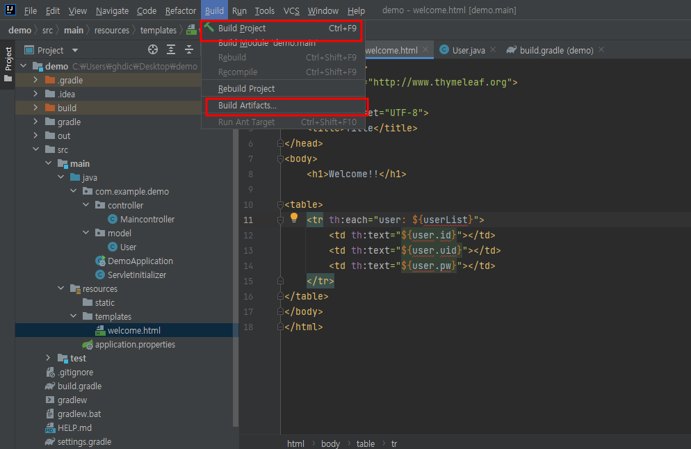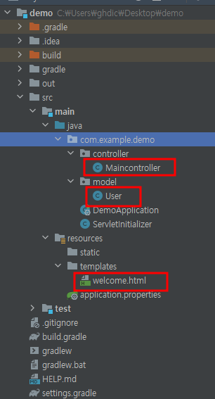 Maincontroller.class, User.class, welcome.html 파일을 생성해준다