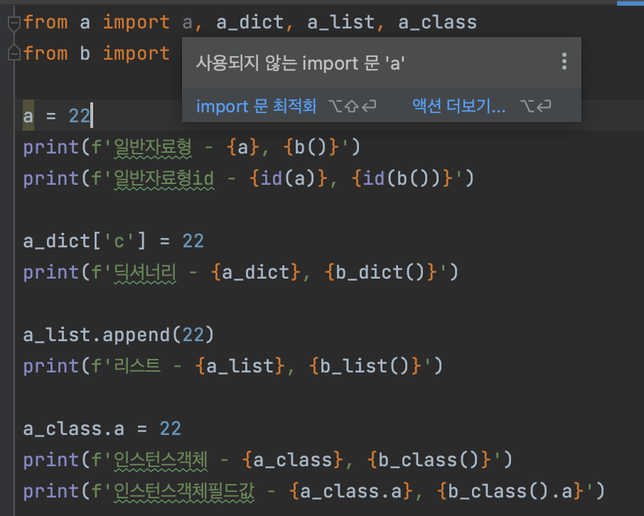 파이참ide에서 보면 from a import a를 통해 가져온 일반변수 a보다 c.py에 a = 22라고 선언된 글로벌 변수보다 우선순위가 밀린것을 알 수있다(그저 새로운값을 할당하려 했던거뿐인데..)